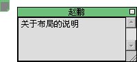 的作用是在文件中写入一段文字注释内容,这主要应用在将文件交于其他人使用的时候。也可以作为自己的备忘录。在画面中单击即可出现文字输入框,如下左图。可在公共栏中设定作者、字体、字号和标签颜色。也可以改变文字框大小。输入完成后点击输入框右上角的白色方块即可关闭。关闭后只在画面上留下一个小标签记号。双击标签即可展开文字框,此时可以修改文字内容。若要删除注释,可选择后按删除键〖Delete〗,或在小标签上点击右键选择“删除注释”。