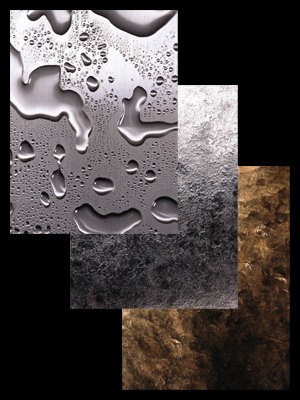图层混合模式使用简单,其中最常用的混合模式有:正片叠底、滤色、叠加。不必去深究其作用原理,只需要有足够多的素材图片,并不断的尝试,就会经常出现意想不到的优秀效果。如下左图,我们将3个图片分别存放于不同的图层中,将位于最上层的水珠图片设为“叠加”混合模式,然后分别开启下方的两个图层,就能得到不同的水珠背景和成效果,如下中图和右图。